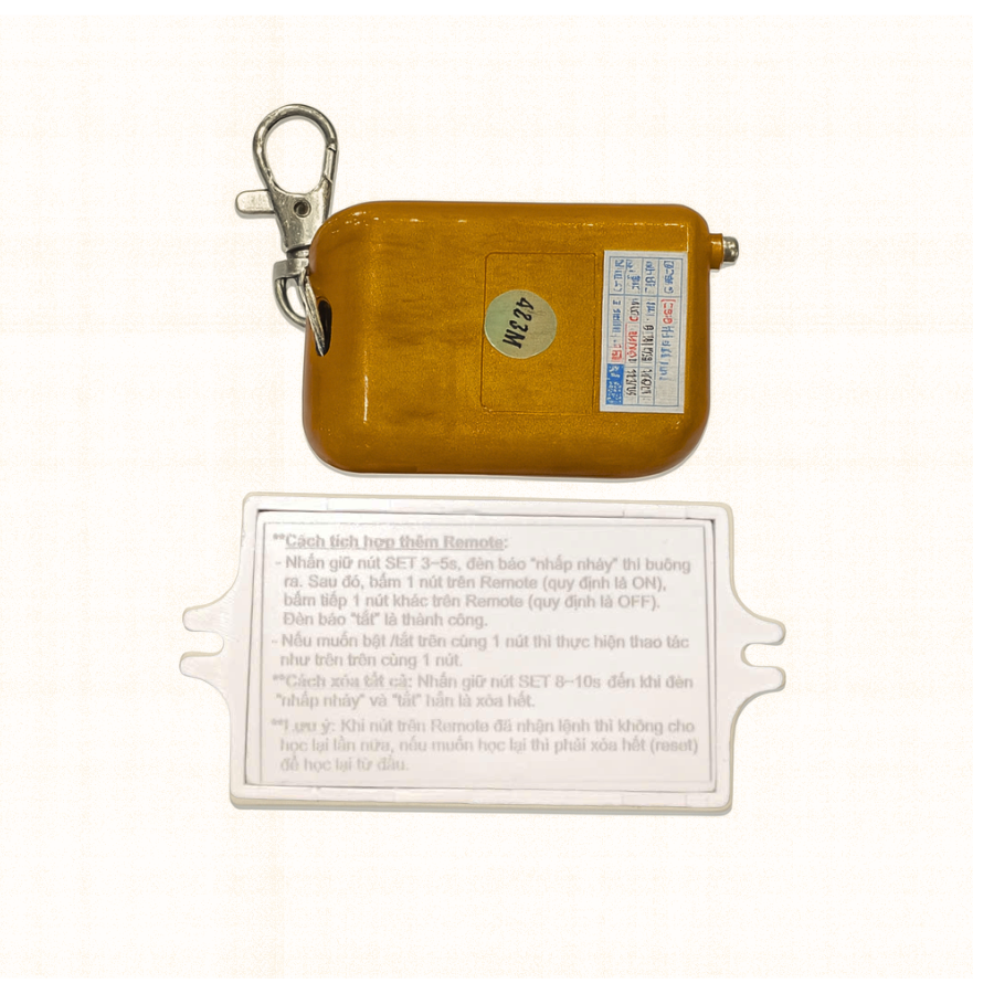 - Nhấn giữ nút SET 3~5 giây,đèn báo nhấp nháy thì bấm 1 nút trên remote (giữ 1~2giây) thấy đèn tắt thì nhả tay ra, sau đó đèn chớp lại thì bấm lại nút đã chọn vừa bấm trên remote, đèn báo tắt là thành công. Nếu muốn chọn 1 nút ON và 1 nút OFF khác nhau thì khi bấm lần 2 (trên remote) thì chọn 1 nút khác.